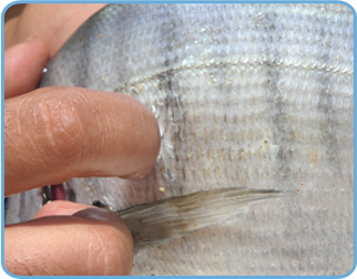 Les écailles doivent être brillantes et adhèrent fermement à la peau du poisson, si elles se détachent facilement au simple toucher de l’angle du doigt, c’est un mauvais signe. Cela veut dire que le poisson a fait du chemin : Evitez-le !