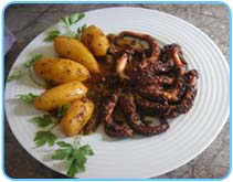 Servez le poulpe dans les assiettes avec les patates douces, arrosez copieusement le tout d'huile d'olive . |